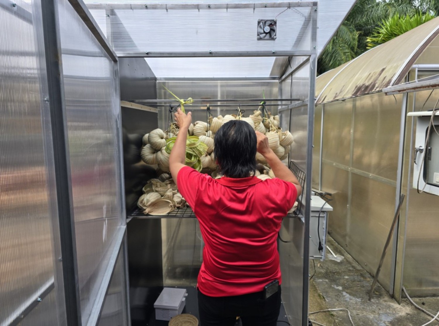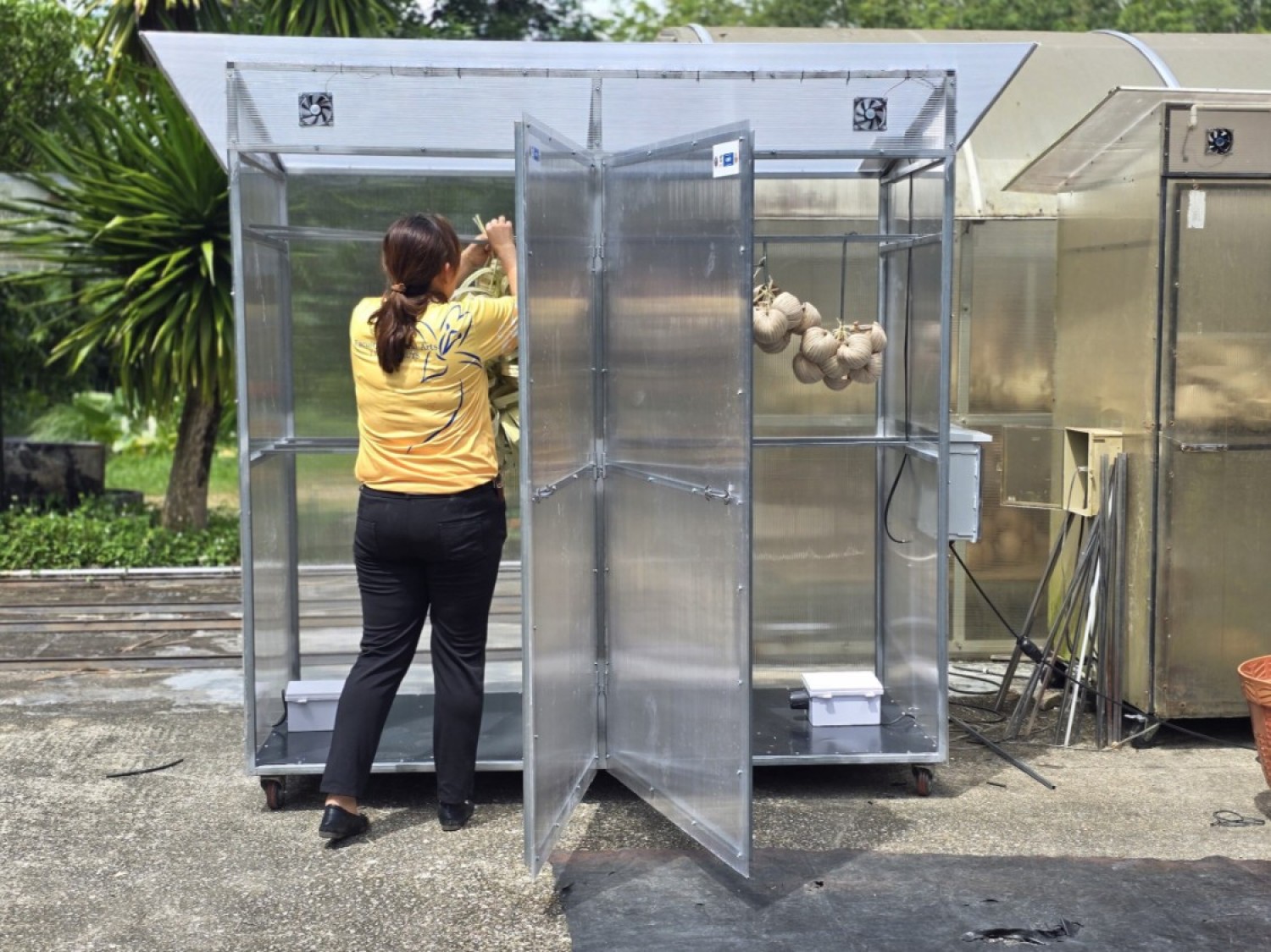 ตู้อบมีลักาณะเป็นทรงสี่เหลี่ยม โครงสร้างทำจากเหล็กกัลวงไนซ์ บุผิวด้านข้างและหลังคาโโยใช้แผ่นโพลีคาร์บอเนตชนิดใส ภายในตู้จะแบ่งห้องอบออกเป็น 2 ห้อง ในแต่ละห้องอบจะติดตั้งฮีทเตอร์ห้องละ 1 ตัว และในแต่ละห้องจะมีราวแขวนใบจาก ฐานของตู้จะมีล้อเลื่อนทำให้สามารถเคลื่อนที่ได้ง่าย