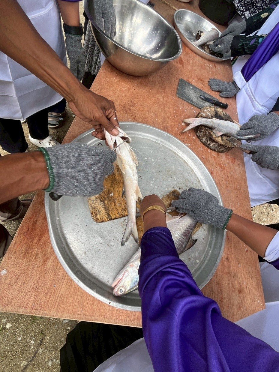 นำปลาที่ตากแดดมารีดน้ำออกจากตัวปลา โดยใช้ไม้คลึงตัวปลาเบา ๆ ทำให้ครบ 18 วัน