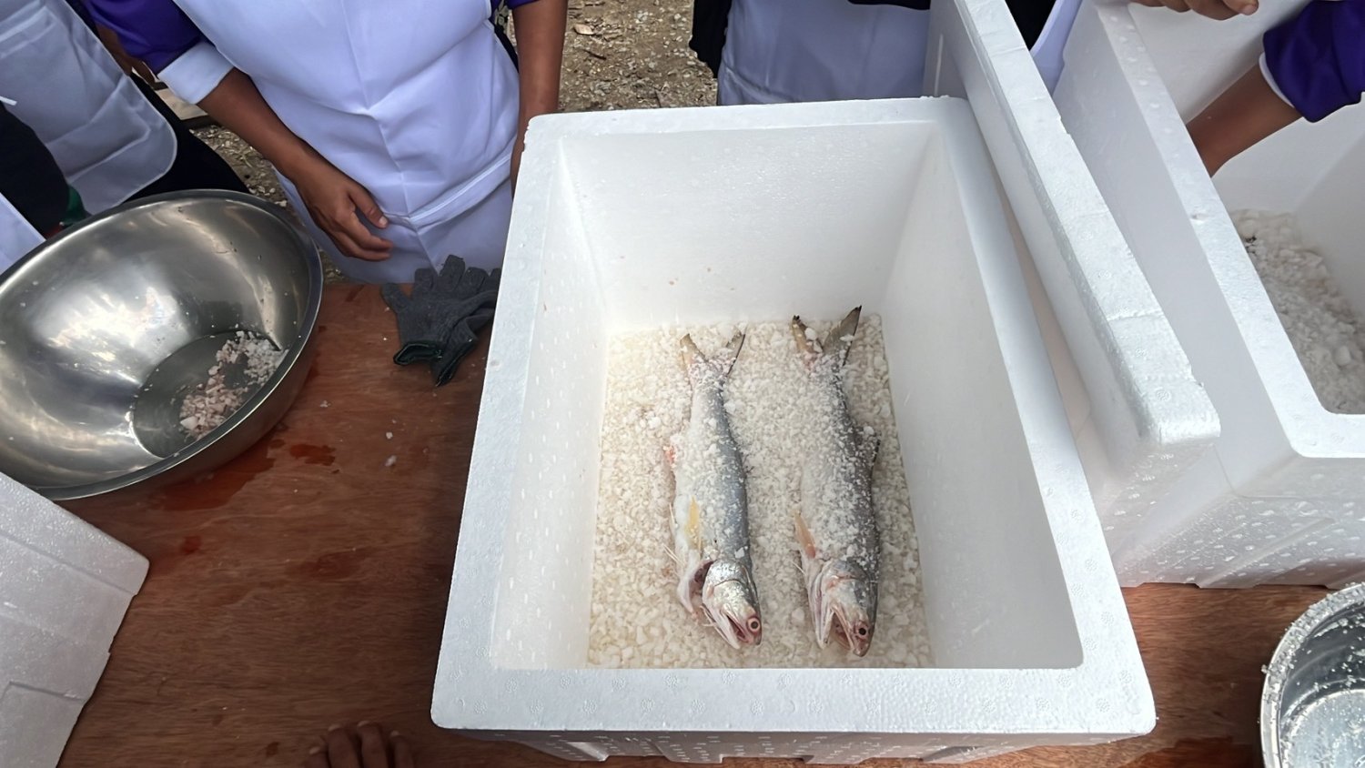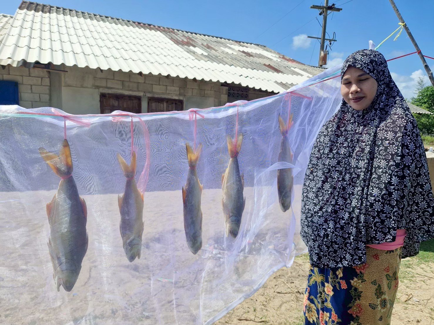 นำปลามาตากแดด โดยการห้อยหัวลงเพื่อให้น้ำออกจากหัวปลา