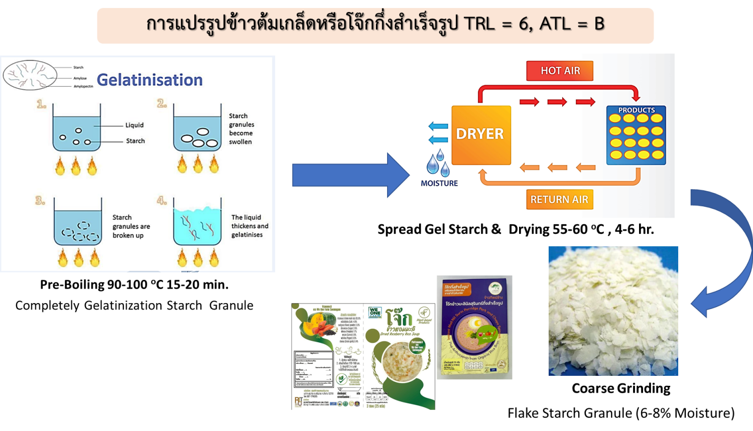 องค์ความรู้ในการเตรียมข้าวต้มสุก และใช้เทคโนโลยีการทำแห้งข้าวทั้งโดยการใช้แสงแดด ตู้อบแสงอาทิตย์ ตู้อบลมร้อน หรือเครื่องอบแห้งแบบลูกกลิ้ง ได้เป็นข้าวต้มเกล็ดแห้ง หรือโจ๊กกึ่งสำเร็จที่คืนรูปได้ง่ายโดยการเติมน้ำร้อนลงไปตั้งทิ้งไว้ไม่เกิน 3 นาที จะได้ข้าวต้มเกล็ดหรือโจ๊กสุกพร้อมบริโภค