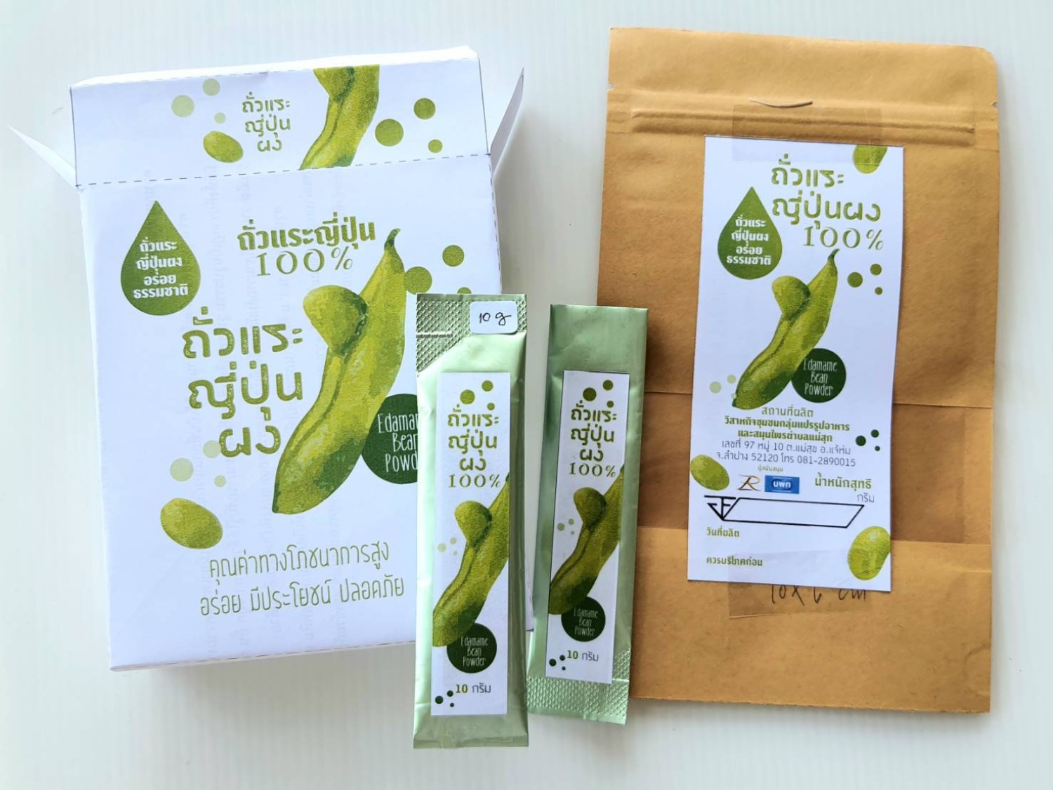 การแปรรูปถั่วแระญี่ปุ่นผง/ถั่วเหลืองผง เป็นชุดความรู้ขั้นตอนกระบวนการเตรียมถั่วแระญี่ปุ่น/ถั่วเหลืองที่เหมาะสม แล้วนำไปทำแห้งด้วยเทคโนโลยีที่ง่าย ใช้เครื่องมืออุปกรณ์ในการแปรรูปโดยใช้วัสดุ-อุปกรณ์งานบ้านงานครัว โดยนำถั่วเหลืองไปทำให้สุก/บดสับ นำไปทำแห้งโดยใช้ตู้ทำแห้งที่อุณหภูมิ 60-110 องศาเซลเซียส ถั่วแระญี่ปุ่นผง/ถั่วเหลืองผงที่ได้มีความชื้นต่ำ และมีอายุเก็บรักษาอย่างน้อย 1 ปี ณ อุณหภูมิห้องปกติ ผลิตภัณฑ์มีน้ำหนักเบา จึงสะดวกในการบรรจุและขนส่ง ผลิตภัณฑ์มีสีกลิ่นรสที่เฉพาะตัวตามธรรมชาติของถั่วแระญี่ปุ่น/ถั่วเหลือง ผลิตภัณฑ์ที่ได้สามารถนำไปต่อยอดพัฒนาเป็นเครื่องดื่มต่างๆ หรือเป็นวัตถุดิบผงสำหรับเป็นส่วนผสมของอาหารอื่นๆ ขึ้นอยู่กับความต้องการของผู้บริโภค/ตลาด/ผู้ประกอบการ