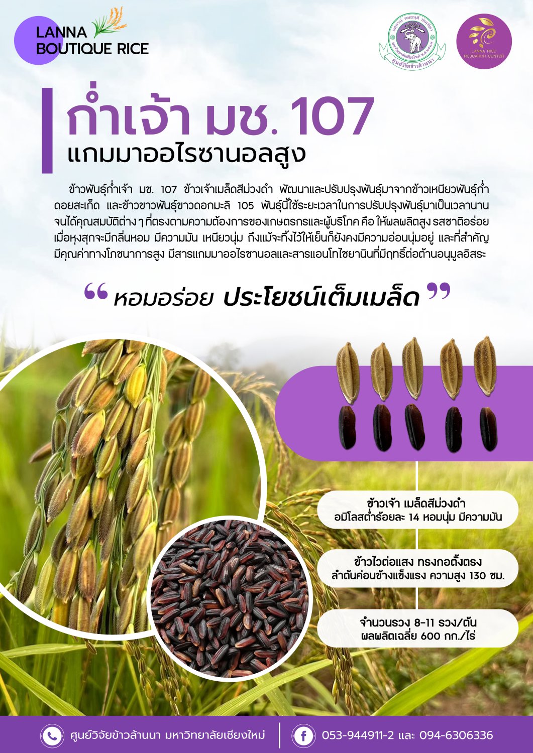 พันธุ์นี้ใช้เวลาการปรับปรุงมาเป็นระยะเวลานาน จนได้ข้าวเจ้า เมล็ดสีม่วงดำ มีสารแอนโทไซยานินสูง และแกมมาออไรซานอลในเมล็ดสูง ที่ได้มาจากพันธุ์ก่ำดอยสะเก็ด และได้ลักษณะความเป็นข้าวเจ้า นุ่ม และความหอม จากพันธุ์ขาวดอกมะลิ 105 พันธุ์นี้มีลักษณะลำต้นแข็งแรง ไม่ล้ม ผลผลิตค่อนค่างดี 400-700 กิโลกรัมต่อไร่ จึงเป็นที่ยอมรับของเกษตรกรและผู้บริโภค