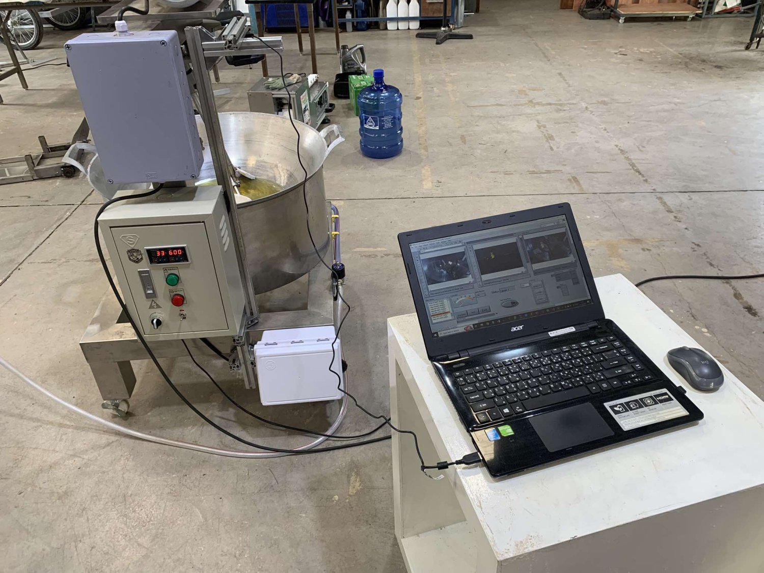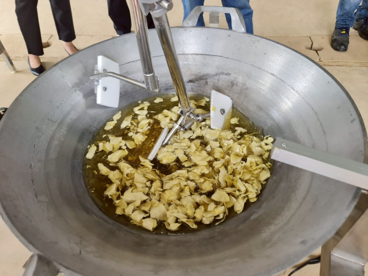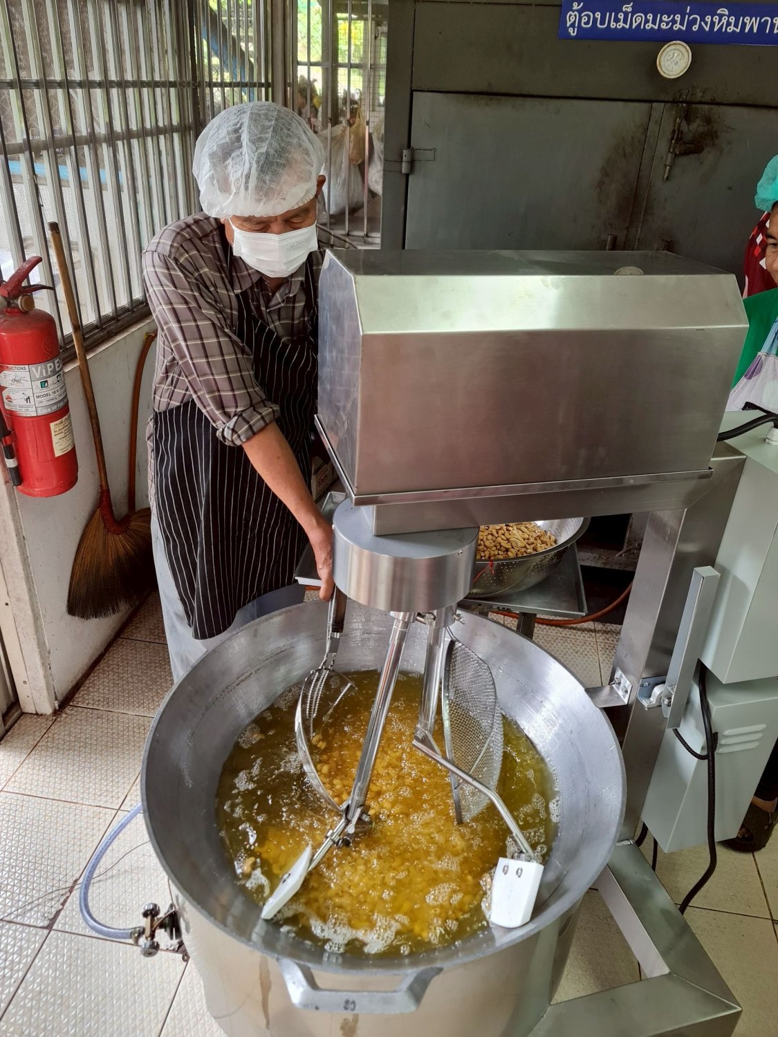 เครื่องกวนทอดด้วยระบบควบคุมอุณหภูมิและระบบตรวจจับสีใช้ในการกวน/ทอด/ผสม ผลิตภัณฑ์ร่วมกับระบบควบคุมอุณหภูมิด้วยระบบเปิดปิดแก๊สและใช้ระบบตรวจจับสีประเมิณเวลาที่ใช้ในกระบวนการ โดยมี 3 ระบบ คือ 1. ระบบชุดใบกวน/ทอด ที่ปรับความเร็วได้ 5 ระดับ 2. ระบบควบคุมอุณหภูมิให้อยู่ในช่วงที่กำหนดโดยมีหัววัดอุณหภูมิที่ติดไว้เหนือกระทะเพื่อวัดอุณหภูมิทางอ้อมเเละใช้เป็นค่าที่ควบคุมอุณหภูมิในการประหยัดเเก๊ส 3. ระบบตรวจจับสีจะใช้ชุดกล้องในการจับภาพที่เวลาต่างๆ เเละนำค่าที่ได้ไปแบ่งกลุ่มระดับสี เเล้วจึงวิเคราะห์ช่วงเวลาที่เหมาะสมในการกวน/ทอดเเล้วจึงนำไปตั้งเวลาที่ชุดควบคุมอุณหภูมิ