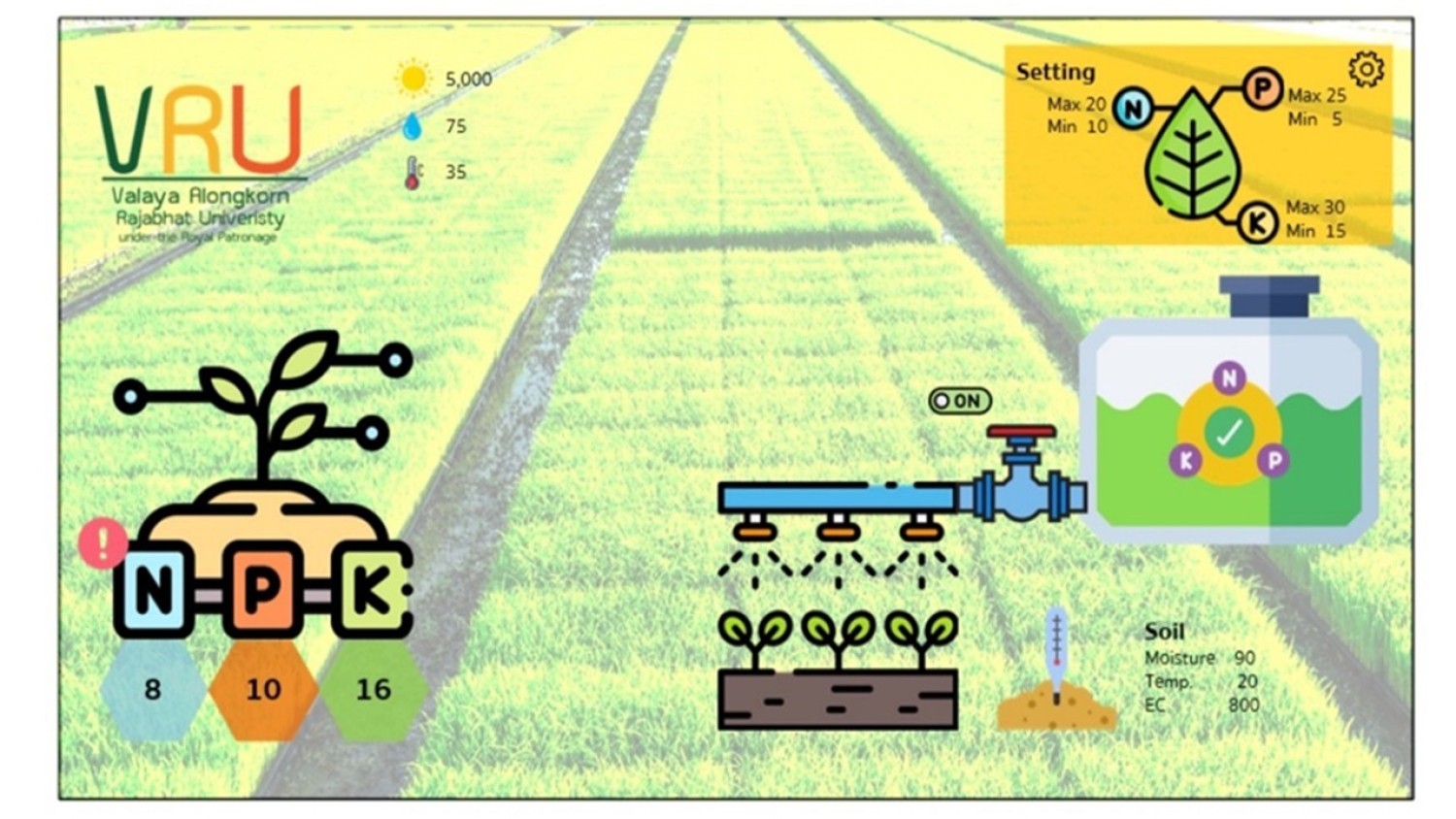 เทคโนโลยีสามารถตรวจวัดแร่ธาตุ ค่าความชื้น และค่าการนำไฟฟ้าในดิน และเชื่อมต่อกับการสั่งการการให้ปุ๋ยกึ่งอัตโนมัติในพื้นที่เกษตร