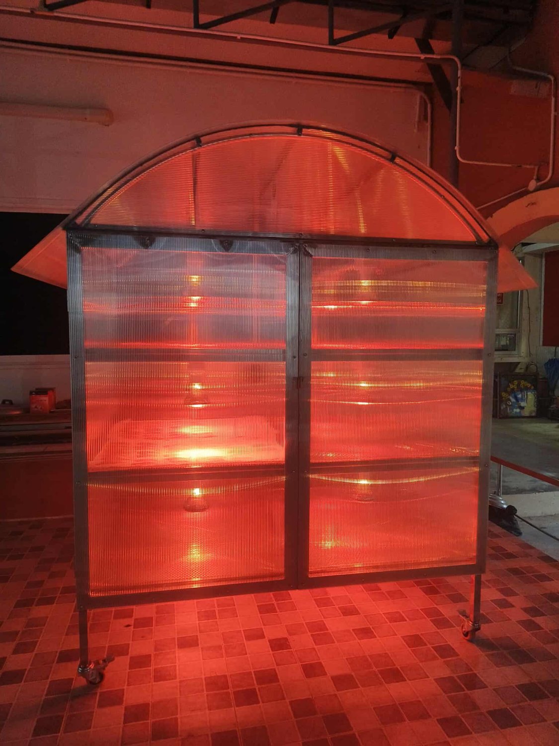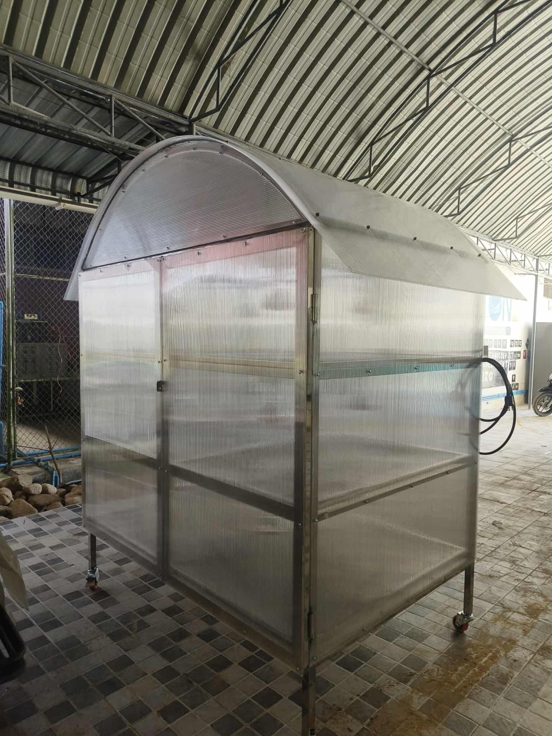 2. ลักษณะโครงสร้างและวัสดุ (Specifications) ออกแบบโดยเน้นความทนทานต่อสภาพอากาศชายทะเล (ไอเค็ม) และความปลอดภัยทางอาหาร (Food Safety) โครงสร้างหลัก: ทำจาก อลูมิเนียม (Aluminum 6063-T5) ซึ่งมีน้ำหนักเบา ไม่เป็นสนิม เหมาะกับพื้นที่ชายฝั่งทะเล ผนังตู้: วัสดุ โพลีคาร์บอเนต (Polycarbonate) ชนิดใส ทนความร้อนได้ดี เก็บกักความร้อนภายในได้ดีเยี่ยม และยอมให้แสงผ่านได้เพื่อให้ผู้ผลิตมองเห็นสินค้าภายใน ตะแกรงวางปลา: ใช้ สแตนเลสเกรด 304 (SUS 304) ซึ่งเป็น Food Grade ไม่เป็นสนิม ทนการกัดกร่อนจากเกลือที่หมักปลา3. ความเป็น "นวัตกรรมพร้อมใช้/เทคโนโลยีที่เหมาะสม" (Appropriateness)
