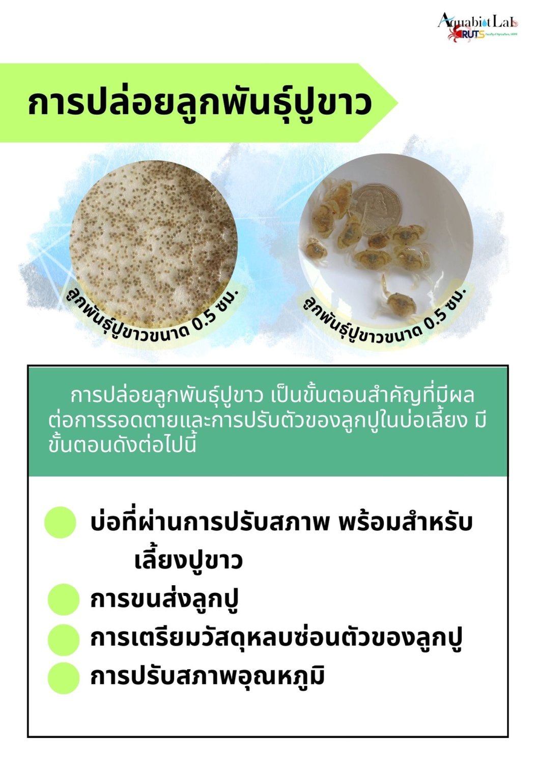 จากนั้นนำถาดหรือถุงบรรจุลูกปูขาวลงลอยในบ่อเลี้ยง