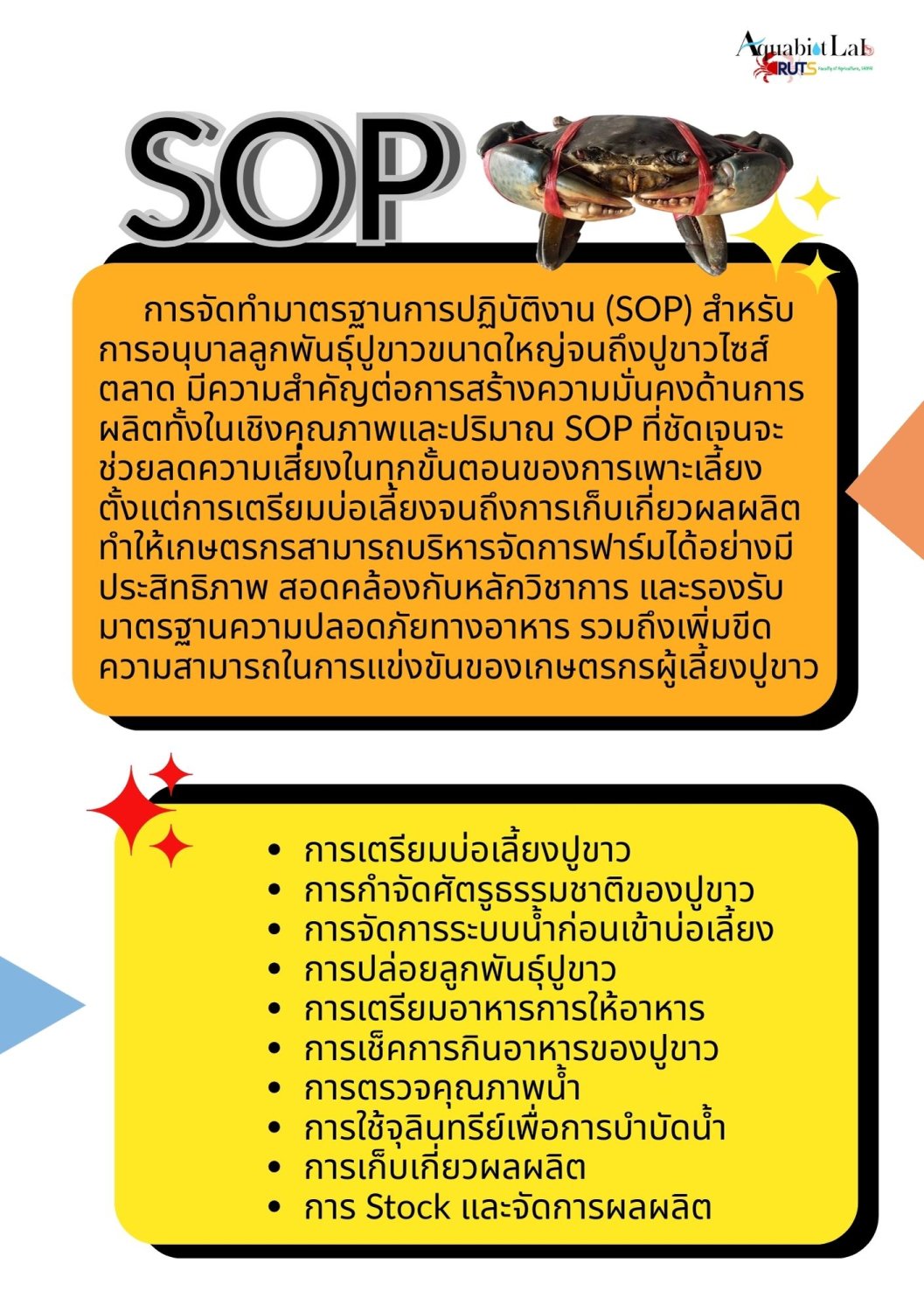 ระบบการเลี้ยงลูกปูขาวขนาด 0.5 เซนติเมตรถึง 5 เซนติเมตรมาใช้งานและต่อด้วย SOP การเลี้ยงปูขาวไซส์ตลาดจากลูกปูขาวขนาด 5 เซนติเมตร