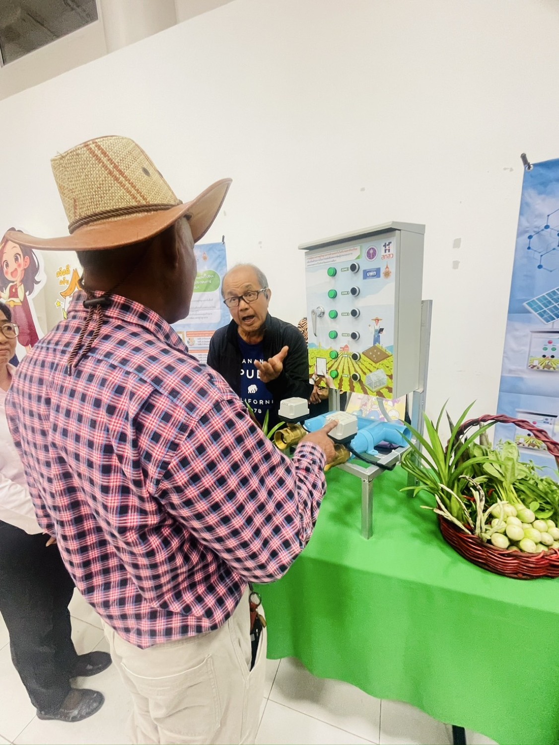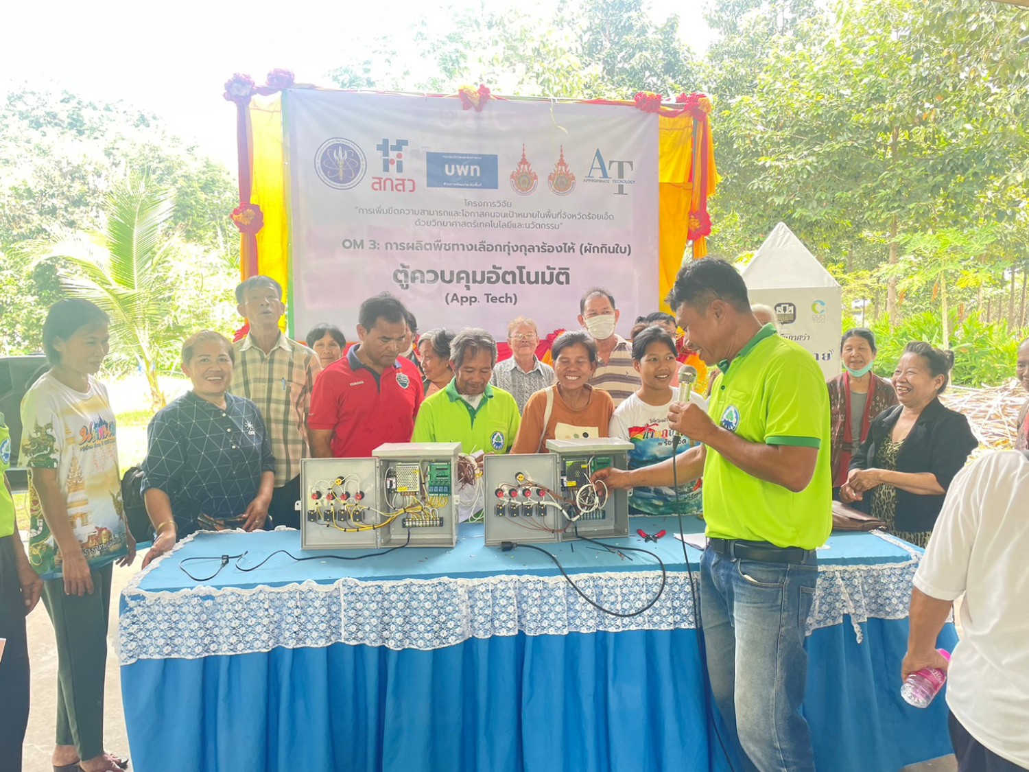 ตู้ควบคุมอัตโนมัติสำหรับเกษตรแปลงใหญ่ เป็นการจัดการระบบน้ำในแปลงเกษตรด้วยการประยุกต์ใช้เทคโนโลยี IoT สิ่งที่สำคัญคือการเรียนรู้บอร์ดควบคุมอุปกรณ์ IoT ควบคุมผ่านแอปพลิเคชันมือถือ ซึ่งเป็นนวัตกรรมพร้อมใช้ที่ทางนักวิจัยได้ออกแบบให้สั่งงานด้วยแอปพลิเคชันมือถือผ่านอินเตอร์เน็ต และสั่งงานด้วยสวิตซ์ที่หน้าตู้ควบคุมการเปิดปิดวาล์วน้ำจำนวน 3 ช่อง ควบคุมการทำงานด้วยแมกเนติกคอนแทคเตอร์ จำนวน 1 ช่อง มีช่องรองรับการต่อเซนเซอร์ 2 ช่อง มีระบบตั้งเวลาทำงานเปิด-ปิด อัตโนมัติ รองรับการเชื่อมต่อพลังงานจาก Solar cell มี Connector แบบสกรู สำหรับรับสัญญาณ Digital และ Analog และยังมี Pin Header สำหรับใช้งานขาพอร์ตอื่น ๆ ได้ตามต้องการ ใช้กับแหล่งจ่ายไฟ 5 - 24V สามารถใช้งานร่วมกับแอปพลิเคชัน Home assistant จากการปรับเทคโนโลยี และสำรวจคะแนนแสดงการยอมรับ App Tech ตู้ควบคุมอัตโนมัติ จากการตอบแบบสอบถามของสมาชิก กลุ่มและคนจนเป้าหมายในห่วงโซ่การผลิตภายใต้กิจกรรมที่ใช้จริง อยู่ในเกณฑ์ ดีมาก (3.69 ± 0.54) ระบบใช้งานง่าย สะดวกต่อการทำงานของผู้สูงอายุ และการผลิตจำนวนมาก ให้ผลผลิตที่สม่ำเสมอ และประหยัดน้ำได้มากกว่าการใช้แรงงานคนรด