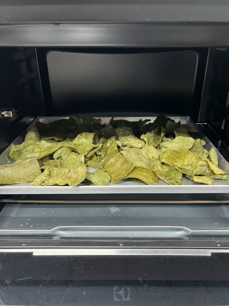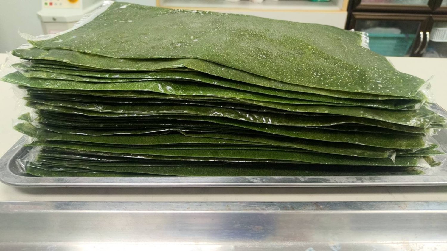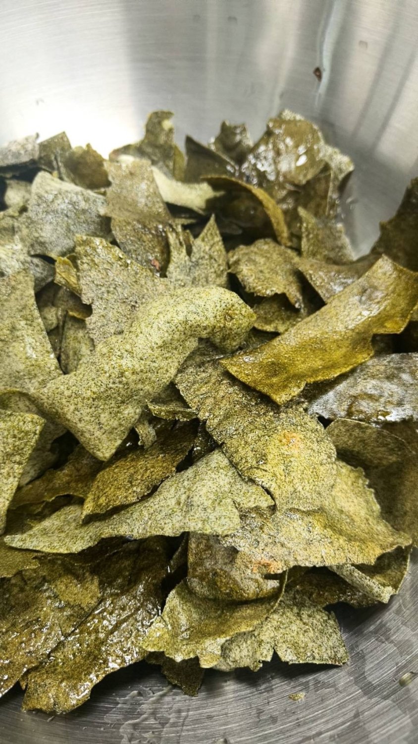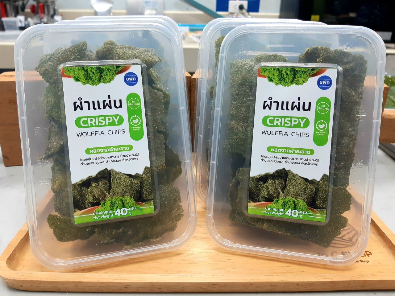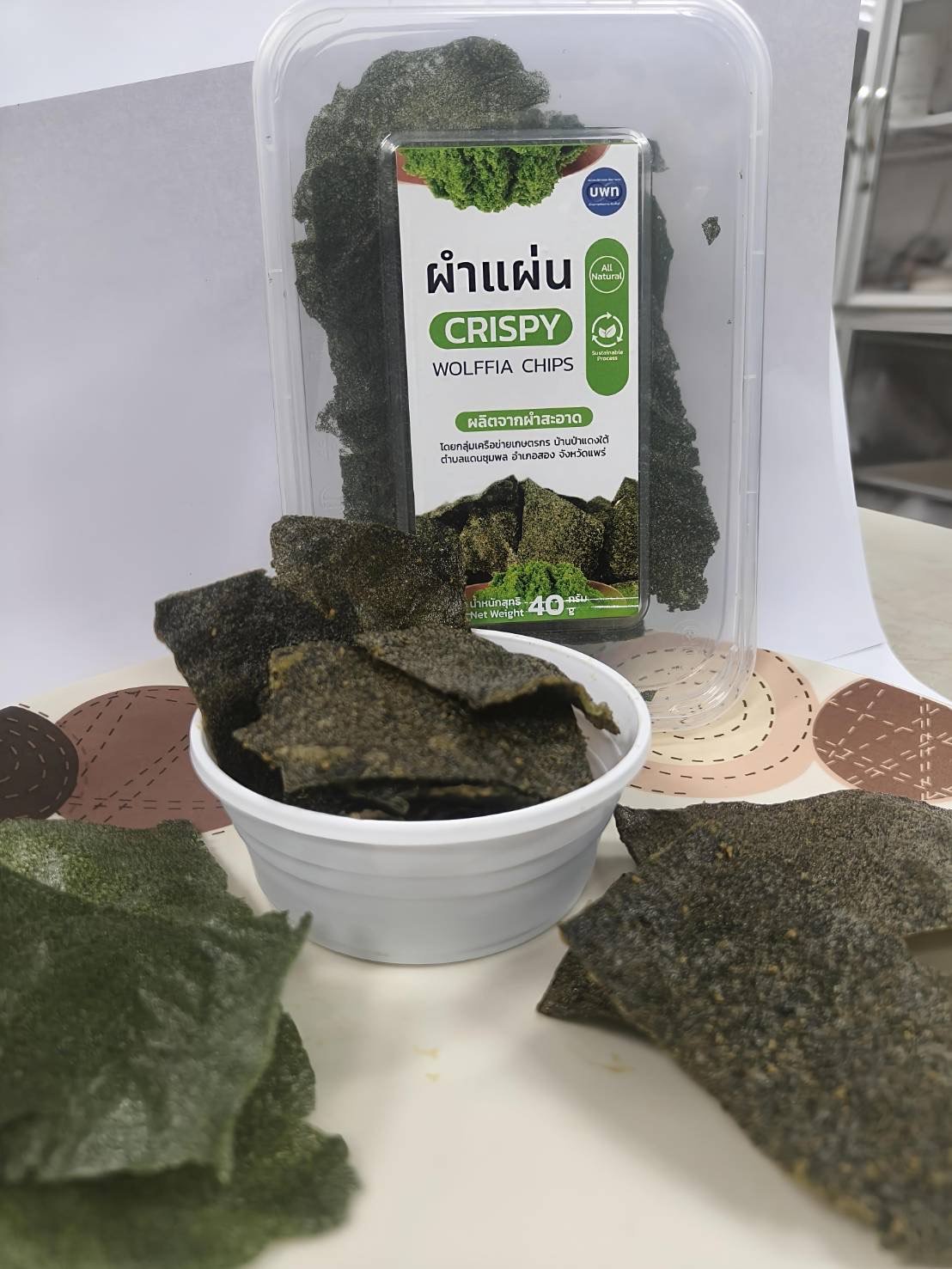 การเทคนิคการลวก เพื่อช่วยในการรักษาสีเขียวของผัก ในการนำมาแปรรูปเป็นผลิตภัณฑ์ผักแผ่นกรอบ การขึ้นรูปใช้ผสมแป้งในอัตรส่วนที่เหมาะสมที่สามารถขึ้นรูปได้