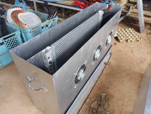 ร้อน (Heat exchanger) ที่ทีมวิจัยได้พัฒนามาจากแผงคอนเด็นเซอร์แอร์รถยนต์เข้าไปกับบ่อเลี้ยงจิ้งหรีดเดิมของ