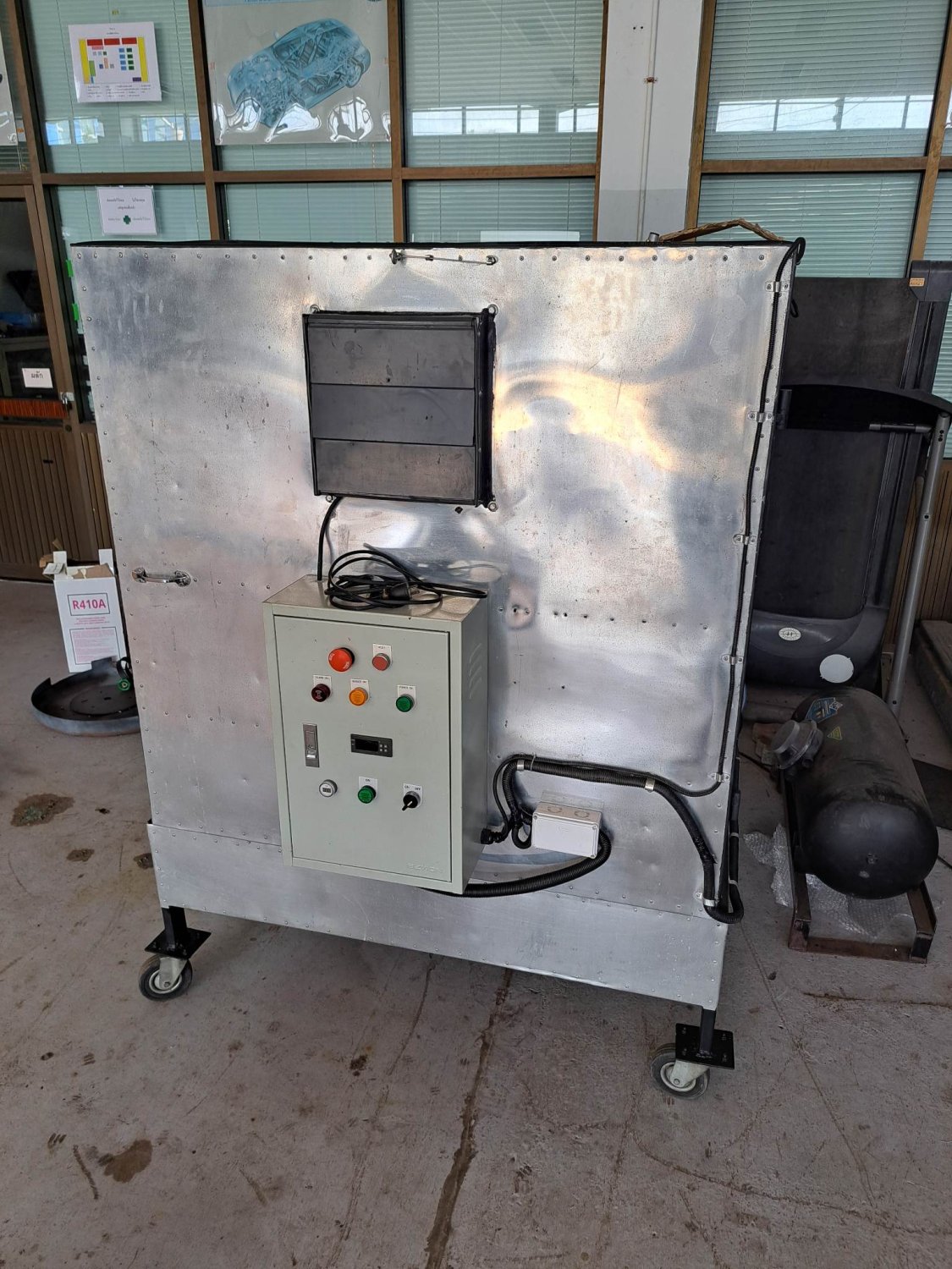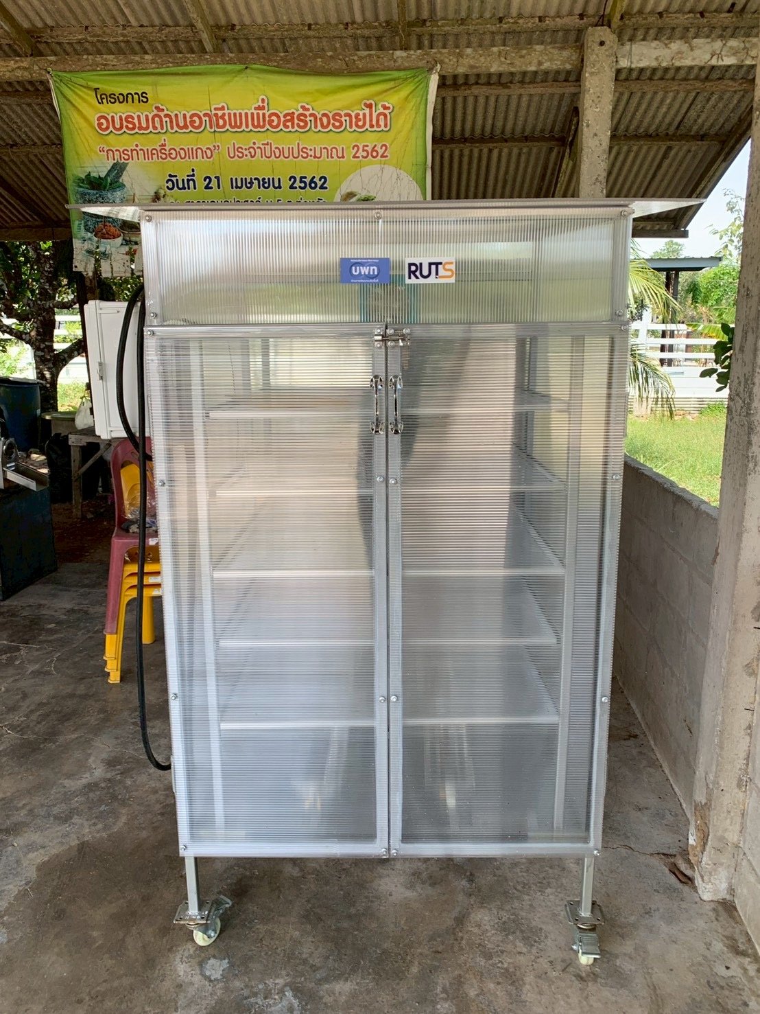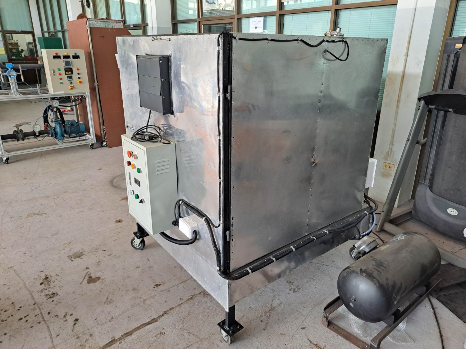 เครื่องอบไล่น้ำมันสำหรับแผ่นมันสำปะหลังทอด นั้นเป็นการประดิษฐ์ที่เลือกใช้เตาแก๊สอินฟราเรดมาเป็นชุดให้พลังงานความร้อนในกระบวนการไล่น้ำมัน เนื่องจากสามารถควบคุมระดับความร้อนได้ง่ายและเร่งความร้อนได้อย่างรวดเร็วรวมถึงปลอดภัยด้วยชุดควบคุมสัญญาณความร้อนอัตโนมัติ ในการทำงานของเครื่องอบไล่น้ำมันจะใช้เตาแก๊สอินฟราเรดร่วมแก๊สหุงต้มเป็นตัวให้ความร้อนและใช้พัดลมดูดอากาศเป็นตัวหมุนเวียนอากาศภายในห้องอบไล่น้ำมัน เครื่องอบอบไล่น้ำมัน มีรูปทรงสี่เหลี่ยมจัตุรัส สำหรับบรรจุแผ่นมันสำปะหลังทอดจำนวน 400-500 แผ่น ผนังเครื่องอบแห้งจะอยู่ในรูปแบบของแผ่นฉนวนสำเร็จรูป ภายในเครื่องอบจะมีการสร้างแผ่นกั้นอากาศร้อนที่เจาะรู เพื่อให้อากาศนำความร้อนจากหัวเผามาไหลผ่านไปยังห้องอบไล่น้ำมันและระบายออกทางด้านบนด้วยพัดลมดูดอากาศ ในการจุดระบบเผาไหม้นั้นจะใช้ชุดควบคุมแก๊สอินฟราเรดเปิด-ปิด ชุดโซลินอยด์วาล์วจะอยู่ด้านล่างเครื่องอบไล่น้ำมันเป็นตัวควบคุมระบบ และถังแก๊สจะติดตั้งอยู่ด้านหลังของเครื่องอบไล่น้ำมัน