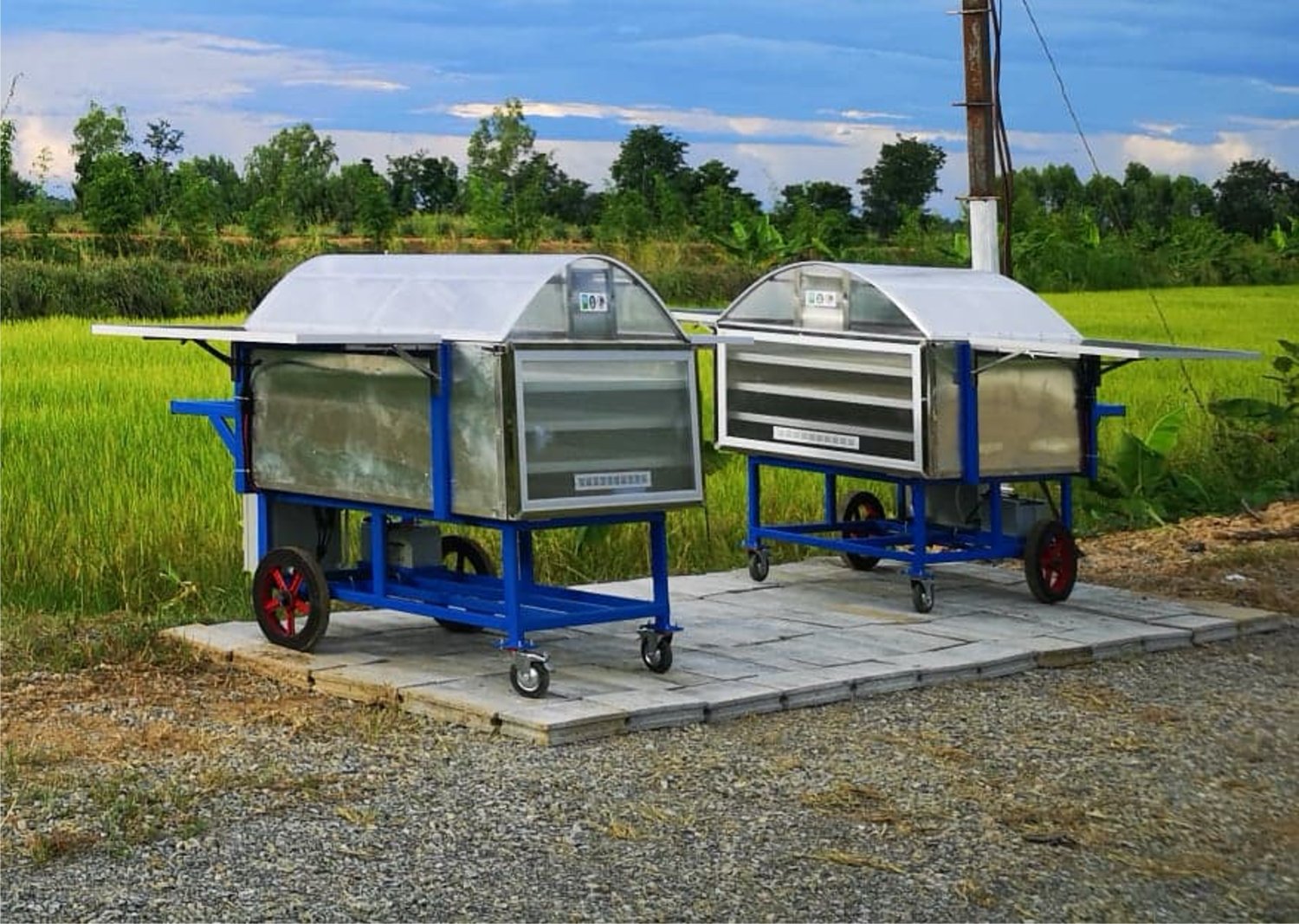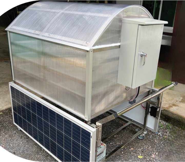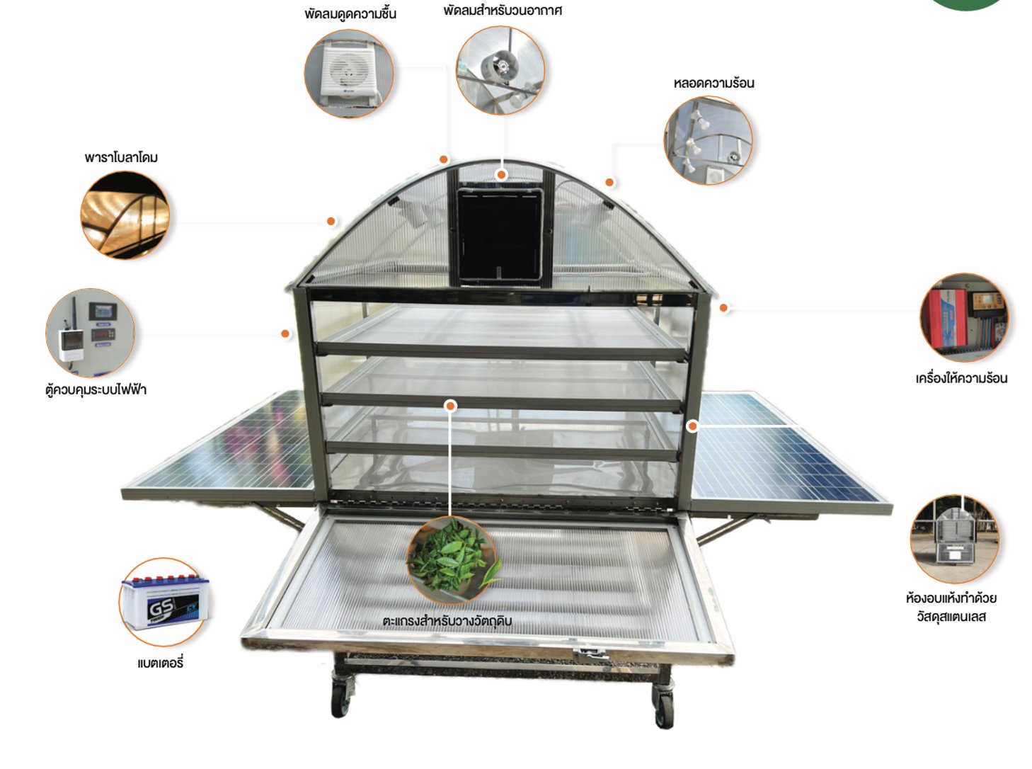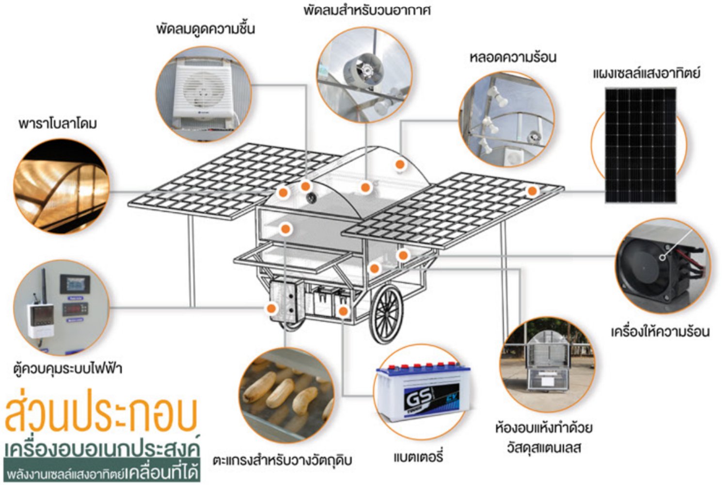 เครื่องอบอเนกประสงค์พลังงานเซลล์แสงอาทิตย์เคลื่อนที่ได้ ประดิษฐ์ขึ้นเพื่อใช้ในการอบแห้งผลผลิตทางการเกษตร ได้แก่ เนื้อสัตว์ ปลา สมุนไพร และผลไม้ สามารถอบได้ทั้งกลางวันและกลางคืน โดยกลางวันใช้ความร้อนจากแสงอาทิตย์ในการอบ กลางคืนใช้ความร้อนจากหลอดความร้อนและเครื่องให้ความร้อนที่ใช้ไฟฟ้าจากแบตเตอร์รี่ที่ประจุจากเซลล์แสงอาทิตย์ สามารถตั้งค่าความร้อนและความชื้นตามความเหมาะสมในการอบวัตถุดิบแต่ละชนิด โดยการติดตั้งเซนเซอร์วัดความร้อนและอุณหภูมิในห้องอบ ห้องอบและตะแกรงทำจากสแตนเลส 304 ซึ่งเป็นเกรดที่ปลอดภัยต่อผู้บริโภค ออกแบบให้สามารถเคลื่อนที่ได้สะดวกเพื่อให้สมาชิกในกลุ่มหมุนเวียนใช้ได้ สามารถลดเวลาในการอบ ลดต้นทุนด้านไฟฟ้า ปลอดภัยจากฝุ่นและแมลงที่เป็นพาหะนำโรค เพิ่มมูลค่าให้ผลผลิตทางการเกษตร สร้างอาชีพและรายได้ให้เกษตรกร
