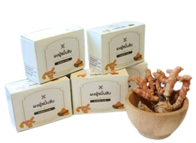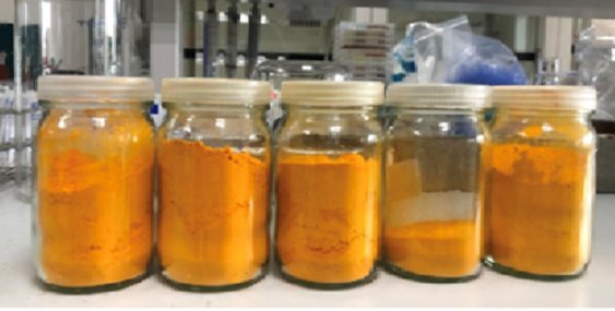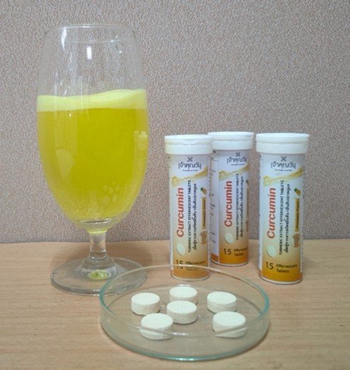 กรดแอสคอร์บิก และพอลิแซ็กคาไรด์ที่สกัดจากขมิ้นชัน ผลิตภัณฑ์สุดท้ายอยู่ในรูปของผงฟู่สีเหลือง