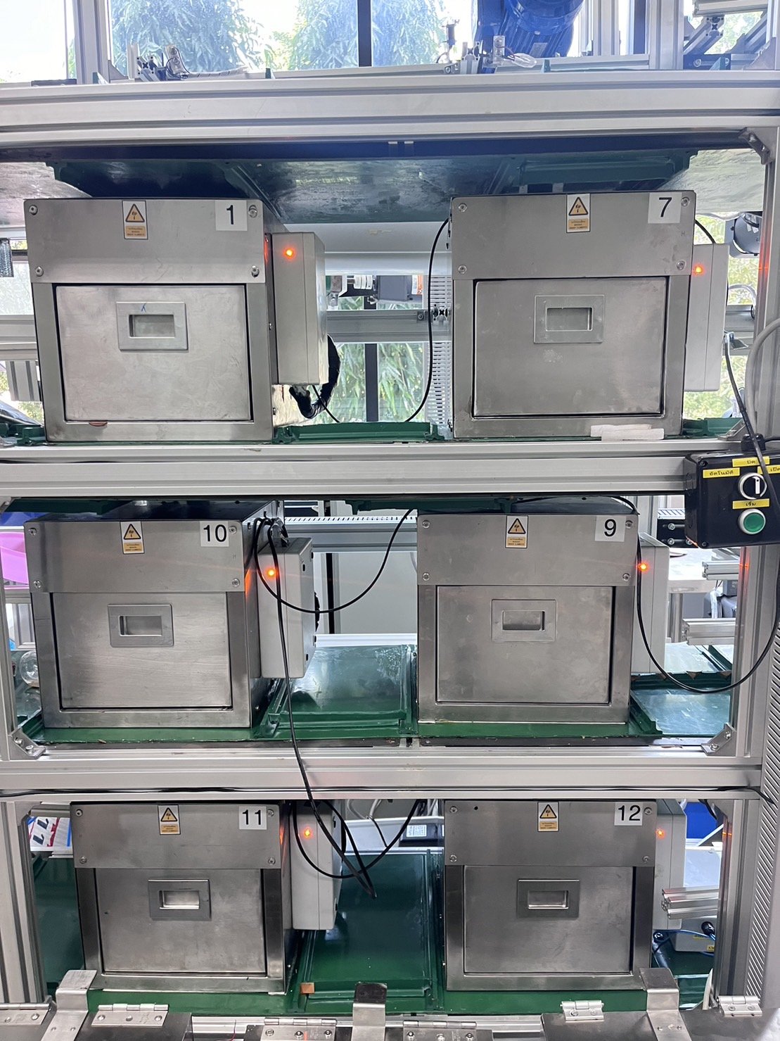 ภายในกล่องเลี้ยง ติดตั้งชุดกลไกอัตโนมัติสำหรับการเคลื่อนย้ายกล่องเลี้ยงเพื่อเติมอาหารและเก็บเกี่ยวผลผลิตด้วยตัวหนอนเมื่อครบรอบการเลี้ยง ชุดเติมอาหารและน้ำ ระบบชะล้างและระบายน้ำเสีย แลชุดตรวจวัดระบบนิเวศ ซึ่งมีการติดตั้งเซนเซอร์ ภายในกล่องเลี้ยงเพื่อวัดอุณหภูมิ ความชื้น และปริมาณแก๊สต่าง ๆ ที่มีผลต่อการเพาะเลี้ยง พร้อมระบบเก็บข้อมูลและติดตามผลแบบเรียลไทม์ ที่เชื่อมต่อกับเซนเซอร์ผ่านระบบอินเทอร์เน็ตที่มีการทำงานที่ปลอดภัยและควบคุมได้ง่าย