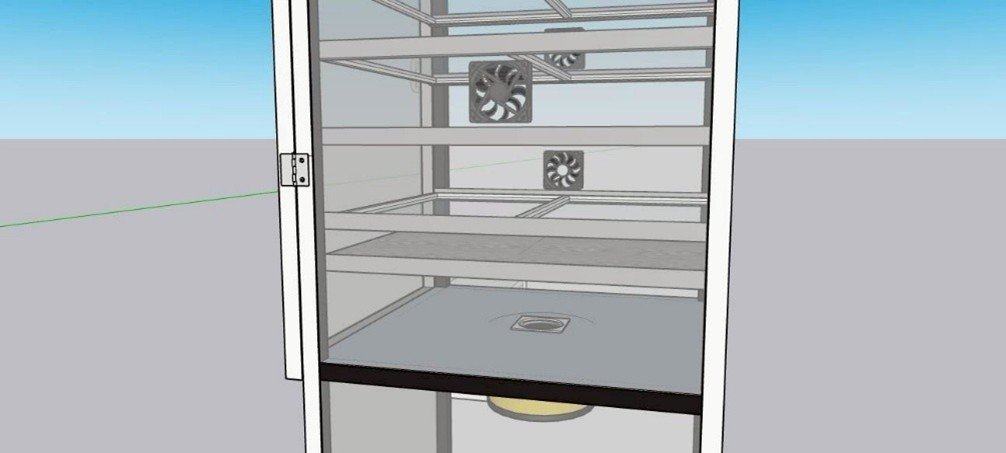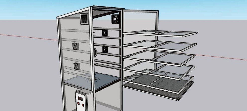 Air Circulation Design ใช้พัดลมหมุนเวียนอากาศ (Axial Fan) เพื่อให้ความร้อนกระจายทั่วทั้งตู้ ลดการเกิดจุดร้อนและทำให้วัตถุดิบแห้งสม่ำเสมอ