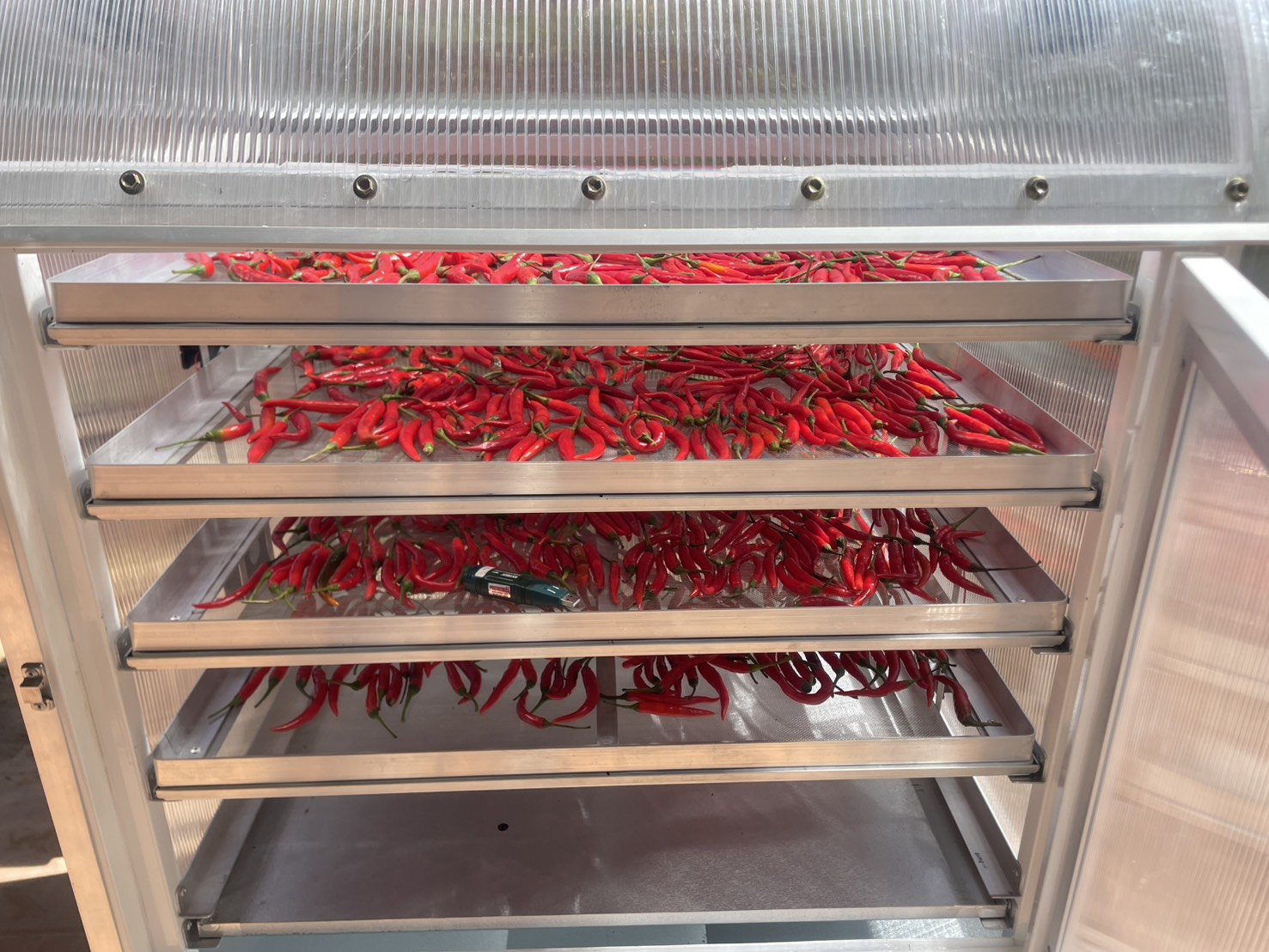 เพิ่มประสิทธิภาพในการอบแห้ง โดยพัดลมได้รับพลังงานจากแบตเตอรี่แห้ง 12Ah ซึ่งสามารถชาร์จพลังงานจากแผงโซลาร์เซลล์ได้โดยตรง