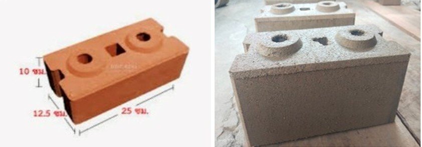 ขนาดมาตรฐาน 12.5 x 25 x 10 ซม. (กว้าง x ยาว x สูง) มีอัตราส่วนผสมที่เหมาะสม โดยใช้ปูนซีเมนต์ปอร์ตแลนด์ประเภทที่