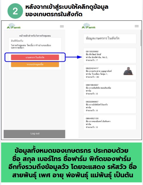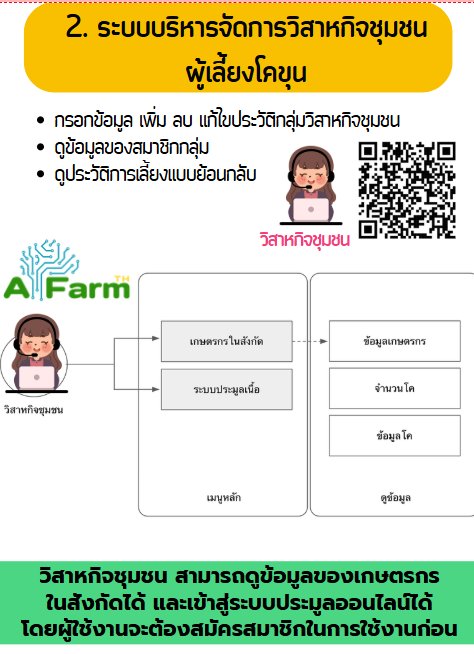 กรอกข้อมูล เพิ่ม ลบ แก้ไขประวัติกลุ่มวิสาหกิจชุมชน ดูข้อมูลของสมาชิกกลุ่ม ดูประวัติการเลี้ยงแบบย้อนกลับ สามารถจัดการข้อมูลสมาชิก แจ้งเตือนกิจกรรมต่าง ๆ และแจ้งสัตว์ป่วย