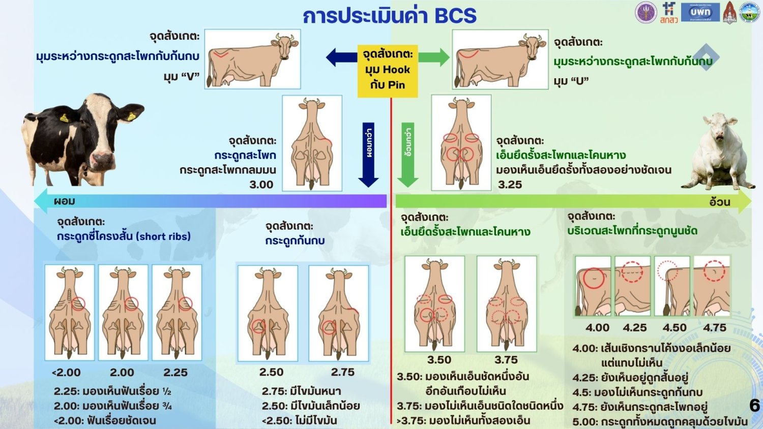 คะแนนร่างกายโคนมในแต่ละช่วงการให้นมนั้น ควรมีความสมบูรณ์ร่างกายที่ไม่อ้วนหรือผอมเกินไป ระดับคะแนนควรอยู่ที่ 2.5-4.0 และแต่ละวัยของโคควรมีความสมบูรณ์ของร่ายกายต่างกัน ตามสถานะของโคในแต่ละช่วงการให้นม ซึ่งความสัมพันธ์ระหว่างคะแนนร่างกาย ปริมาณน้ำนม และความสมบูรณ์พันธุ์ในโคนมก่อนคลอดและโครีดนม เพื่อเป็นแนวทางในการจัดการการให้อาหารให้ตรงตามความต้องการของโคนม หากโคนมก่อนคลอดมีคะแนนร่างกาย ≤3 หรือช่วงคลอดลูกคะแนนร่างกาย 2.75 และ/หลังคลอดมีคะแนนร่างกายลดลง 1.25 คะแนน จะต้องได้รับการจัดการอาหารอย่างเร่งด่วน เพื่อหลีกเลี่ยงสภาวะ NEB ซึ่งส่งผลต่อเป้าหมายการผลิตที่ดี ทั้งปริมาณน้ำนม และความสมบูรณ์พันธุ์ เช่น อัตราการเป็นสัดหลังคลอด และอัตราการผสมติด เป็นต้น