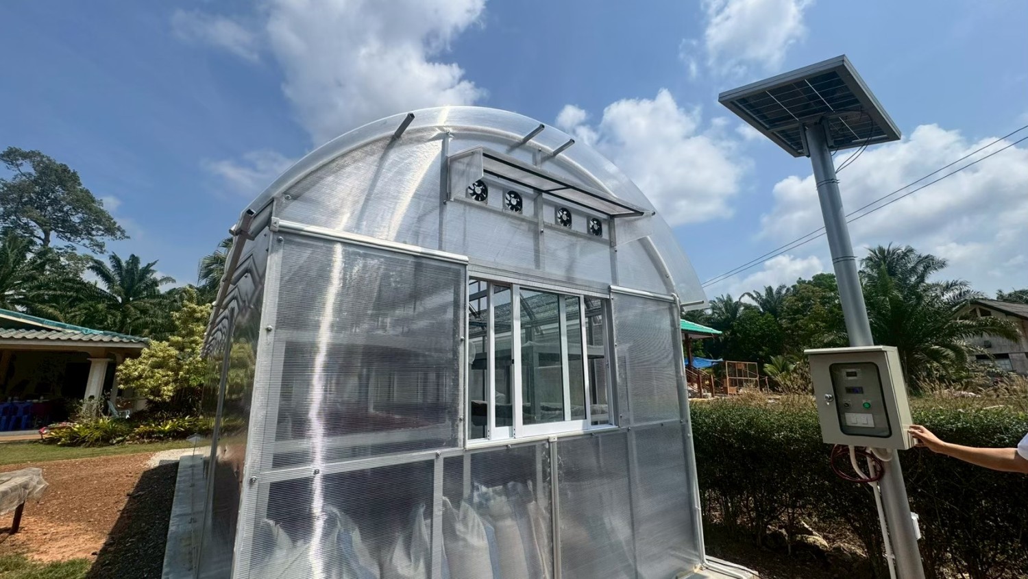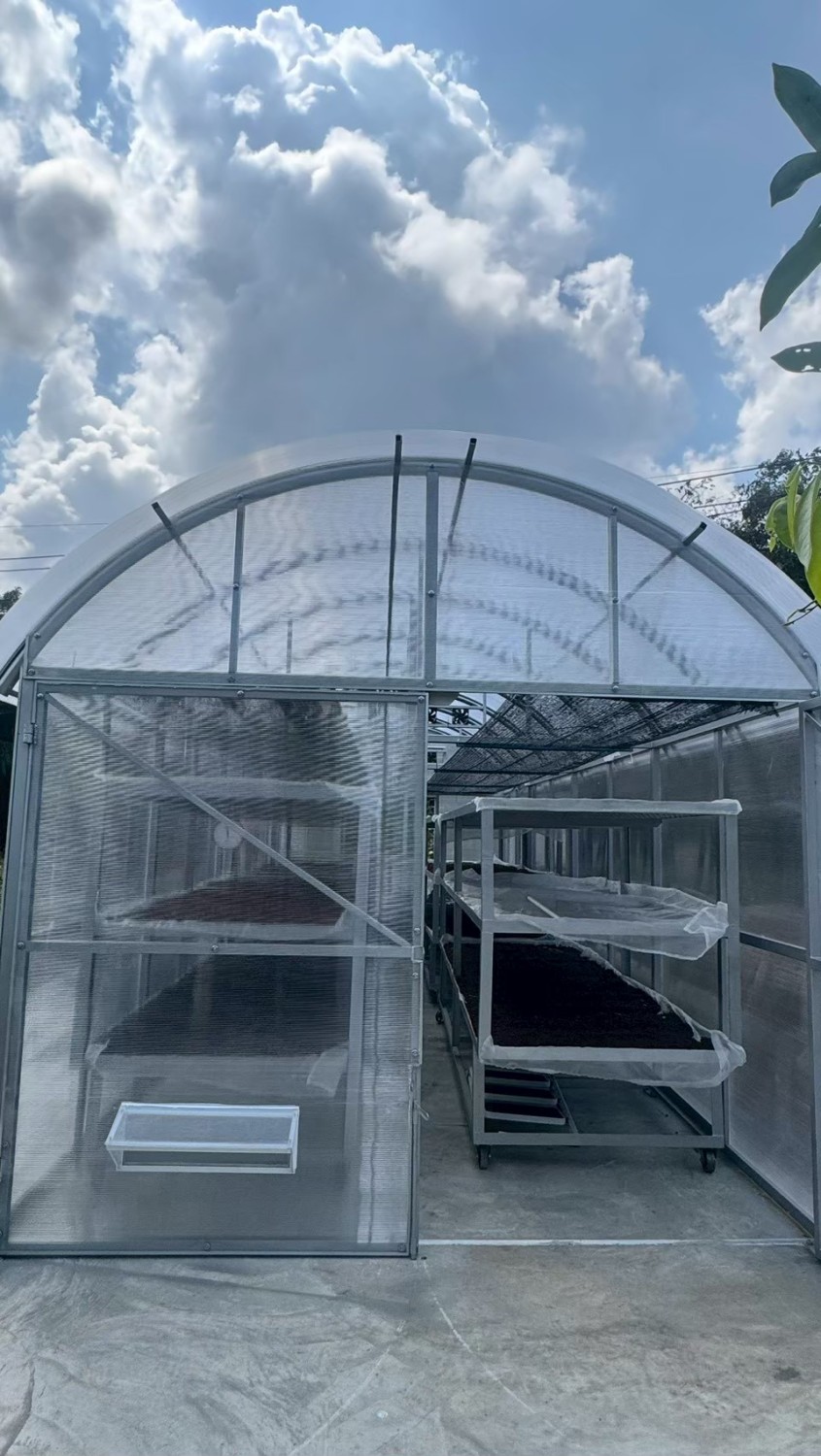 ประยุกต์ใช้การอบแห้งเมล็ดกาแฟด้วยโรงอบแห้งแบบแผ่นโพลีคาร์บอเนตแบบโค้งและหน้าจั่ว ร่วมกับพลังงานไฟฟ้าขนาด 6 เมตร x 6 เมตร (พื้นที่ 36 ตร.ม.)