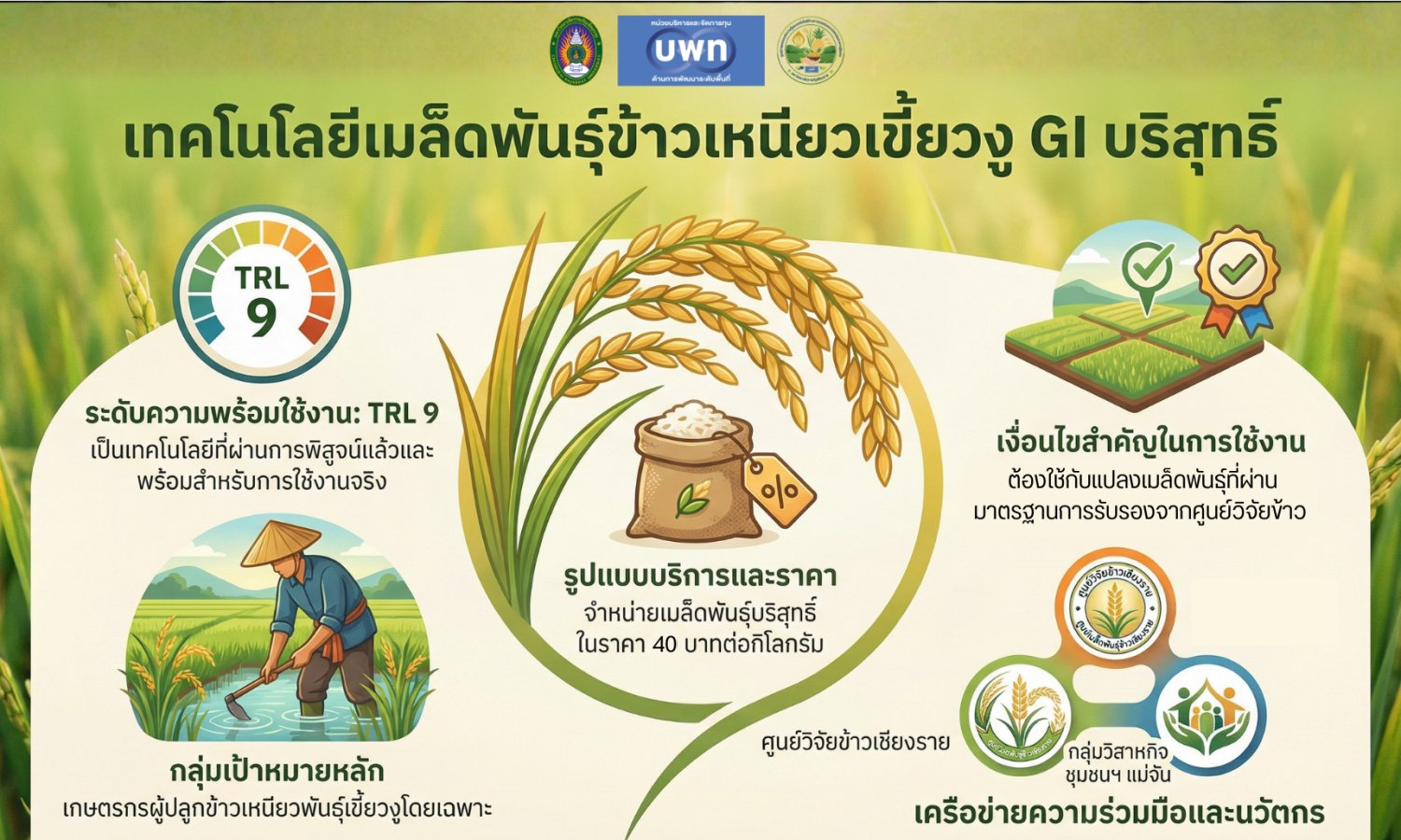 เมล็ดพันธุ์ข้าวเหนียวเขี้ยวงู GI บริสุทธิ์ เป็นเมล็ดพันธุ์ข้าวพื้นเมืองที่มีความสำคัญทางเศรษฐกิจและวัฒนธรรมของภาคเหนือ โดยเฉพาะพื้นที่จังหวัดเชียงราย ซึ่งได้รับการขึ้นทะเบียนเป็นสิ่งบ่งชี้ทางภูมิศาสตร์ (GI) เมล็ดพันธุ์ที่ได้ต้องมีความบริสุทธิ์ทางพันธุกรรมสูง มีลักษณะประจำพันธุ์ชัดเจน เมล็ดเรียวยาว สีขาวใส เมื่อหุงสุกให้ข้าวเหนียวที่มีความนุ่ม เหนียว และมีกลิ่นหอมเฉพาะตัว ต้นข้าวมีความแข็งแรง ทนต่อสภาพแวดล้อมในพื้นที่ เหมาะสมกับสภาพดินฟ้าอากาศของแหล่งผลิต GI และให้ผลผลิตที่มีคุณภาพสม่ำเสมอ