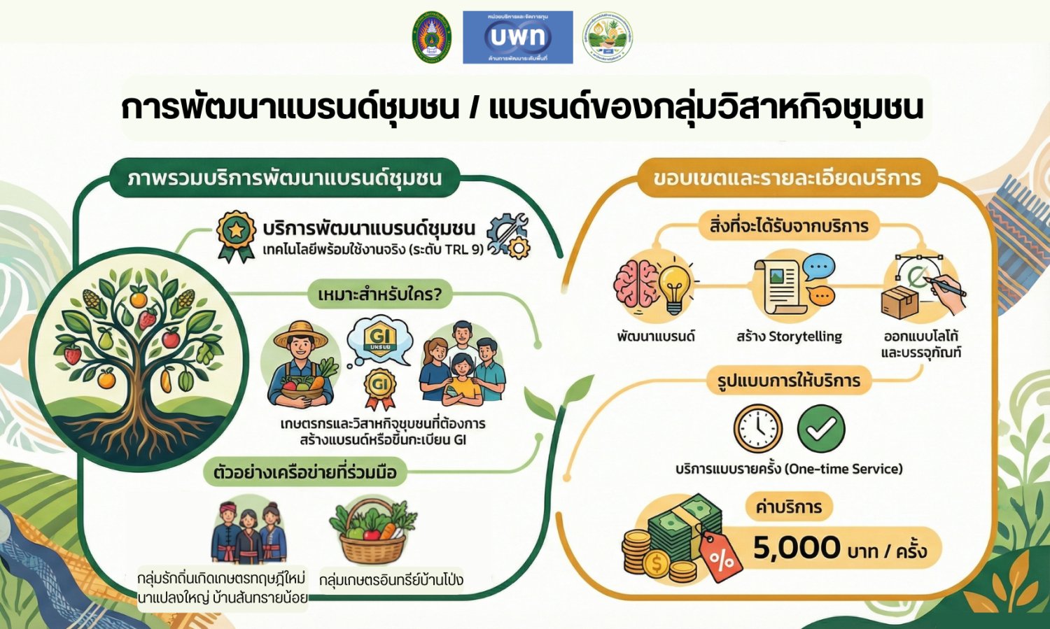 การให้คำปรึกษาและร่วมพัฒนาแบรนด์อย่างเป็นระบบ ตั้งแต่การวิเคราะห์จุดเด่นของชุมชน การร่วมสร้างเรื่องราว (Storytelling) ที่สะท้อนที่มา คุณค่า และภูมิปัญญาท้องถิ่น การออกแบบตราสินค้าชุมชนที่มีเอกลักษณ์และจดจำได้ง่าย
