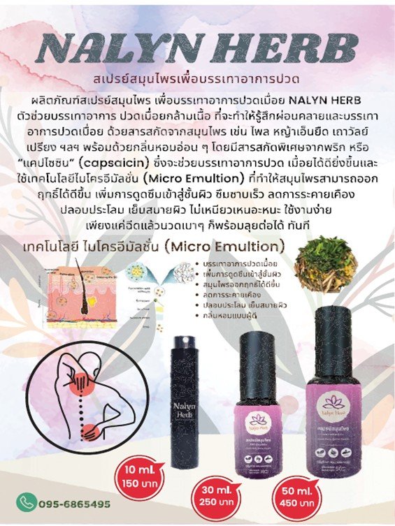 ด้วยเทคโนโลยีการผลิตที่ทำให้อนุภาคมีขนาดเล็กระดับนาโนเมตร ผลิตภัณฑ์จึงมีความเสถียรสูง ไม่แยกชั้น และสามารถกระจายตัวเป็นละอองสเปรย์ที่ละเอียดสม่ำเสมอ ให้สัมผัสที่เบาสบายผิวไม่เหนียวเหนอะหนะ เหมาะสำหรับการใช้ดูแลอาการปวดเมื่อยจากออฟฟิศซินโดรมหรืออาการปวดตึงจากการทำกิจกรรมในชีวิตประจำวัน สเปรย์สูตรนี้จึงเป็นนวัตกรรมที่ตอบโจทย์ทั้งในด้านความสะดวกในการใช้งานและการรักษาคุณค่าทางยาของสมุนไพรไว้อย่างครบถ้วน เพื่อการฟื้นฟูกล้ามเนื้อและข้อต่อได้อย่างเต็มประสิทธิภาพและยั่งยืน