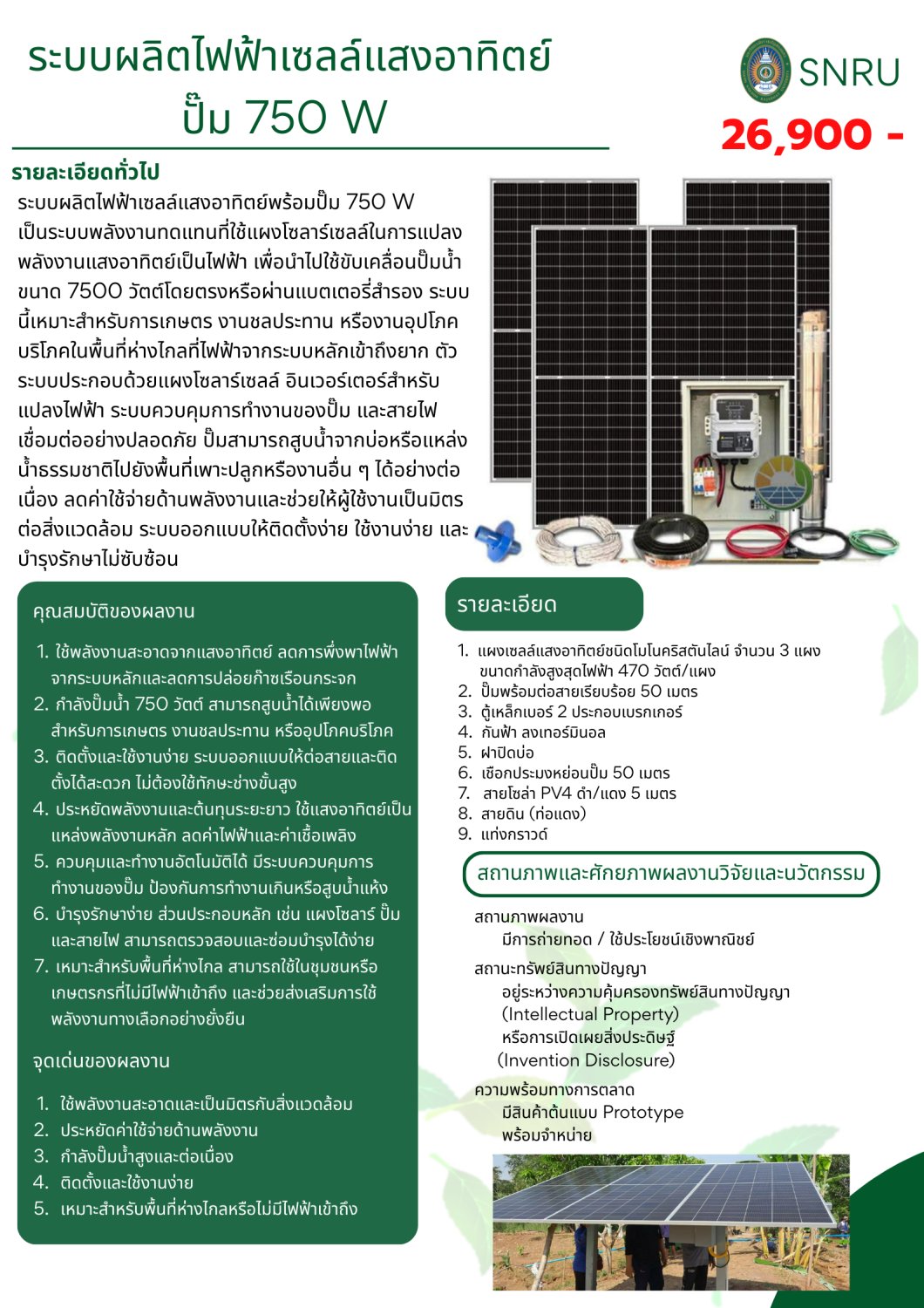 ใช้พลังงานสะอาดจากแสงอาทิตย์ ลดการพึ่งพาไฟฟ้าจากระบบหลักและลดการปล่อยก๊าซเรือนกระจก กำลังปั๊มน้ำ 750 วัตต์ สามารถสูบน้ำได้เพียงพอสำหรับการเกษตร งานชลประทาน หรืออุปโภคบริโภค ติดตั้งและใช้งานง่าย ระบบออกแบบให้ต่อสายและติดตั้งได้สะดวก ไม่ต้องใช้ทักษะช่างขั้นสูง ประหยัดพลังงานและต้นทุนระยะยาว ใช้แสงอาทิตย์เป็นแหล่งพลังงานหลัก ลดค่าไฟฟ้าและค่าเชื้อเพลิง ควบคุมและทำงานอัตโนมัติได้ มีระบบควบคุมการทำงานของปั๊ม ป้องกันการทำงานเกินหรือสูบน้ำแห้ง บำรุงรักษาง่าย ส่วนประกอบหลัก เช่น แผงโซลาร์ ปั๊ม และสายไฟ สามารถตรวจสอบและซ่อมบำรุงได้ง่าย เหมาะสำหรับพื้นที่ห่างไกล สามารถใช้ในชุมชนหรือเกษตรกรที่ไม่มีไฟฟ้าเข้าถึง และช่วยส่งเสริมการใช้พลังงานทางเลือกอย่างยั่งยืนรายละเอียด