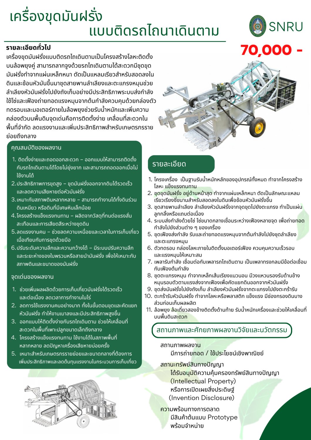 ติดตั้งง่ายและถอดออกสะดวก – ออกแบบให้สามารถติดตั้งกับรถไถเดินตามได้โดยไม่ยุ่งยาก และสามารถถอดออกเมื่อไม่ใช้งานได้ประสิทธิภาพการขุดสูง – ขุดมันฝรั่งออกจากดินได้รวดเร็วและลดความเสียหายต่อหัวมันฝรั่งเหมาะกับสภาพดินหลากหลาย – สามารถทำงานได้ทั้งดินร่วน ดินเหนียว หรือดินที่มีเศษหินเล็กน้อยโครงสร้างแข็งแรงทนทาน – ผลิตจากวัสดุที่ทนต่อแรงสั่นสะเทือนและการเสียดสีระหว่างขุดดินลดแรงงานคน – ช่วยลดความเหนื่อยและเวลาในการเก็บเกี่ยว เมื่อเทียบกับการขุดด้วยมือปรับระดับความลึกและความกว้างได้ – มีระบบปรับความลึกและระยะห่างของใบพรวนหรือสายนำมันฝรั่ง เพื่อให้เหมาะกับสภาพดินและขนาดของมันฝรั่งรายละเอียด