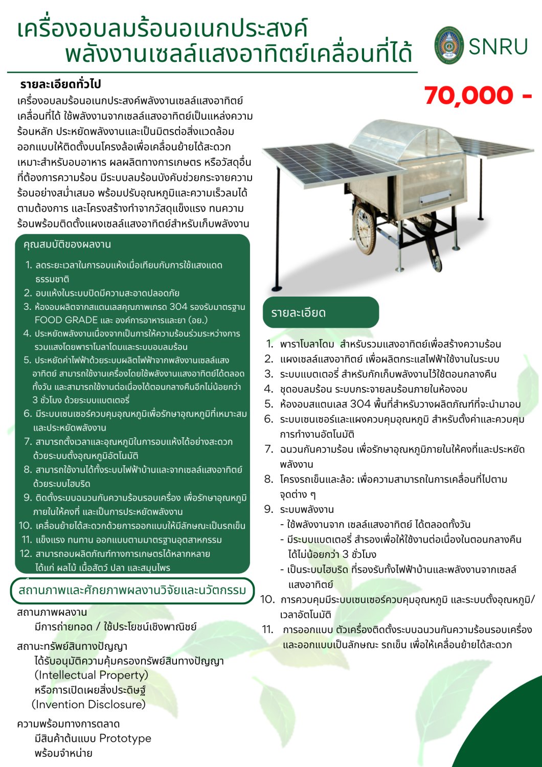 มีระบบเซนเซอร์ควบคุมอุณหภูมิเพื่อรักษาอุณหภูมิที่เหมาะสม และประหยัดพลังงาน สามารถตั้งเวลาและอุณหภูมิในการอบแห้งได้อย่างสะดวก ด้วยระบบตั้งอุณหภูมิอัตโนมัติ สามารถใช้งานได้ทั้งระบบไฟฟ้าบ้านและจากเซลล์แสงอาทิตย์ด้วยระบบไฮบริด ติดตั้งระบบฉนวนกันความร้อนรอบเครื่อง เพื่อรักษาอุณหภูมิภายในให้คงที่ และเป็นการประหยัดพลังงาน เคลื่อนย้ายได้สะดวกด้วยการออกแบบให้มีลักษณะเป็นรถเข็น แข็งแรง ทนทาน ออกแบบตามมาตรฐานอุตสาหกรรม สามารถอบผลิตภัณฑ์ทางการเกษตรได้หลากหลายได้แก่ ผลไม้ เนื้อสัตว์ ปลา และสมุนไพร