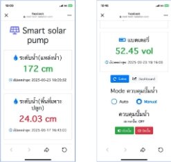 ระบบสูบน้ำพลังงานแสงอาทิตย์อัจฉริยะ ควบคุมและเก็บข้อมูลอัตโนมัติ สำหรับจัดการน้ำในนาแปลงใหญ่ช่วยบริหารจัดการน้ำอย่างแม่นยำ ออกแบบระบบควบคุมที่ใช้งานง่าย ทั้งในรูปแบบอัตโนมัติผ่านเซนเซอร์ และการสั่งงานผ่านเว็บแอปพลิเคชัน ใช้พลังงานแสงอาทิตย์เป็นแหล่งพลังงานหลักในการขับเคลื่อนระบบสูบน้ำ ช่วยลดต้นทุนค่าไฟฟ้าและเพิ่มความมั่นคงด้านพลังงานให้เกษตรกร